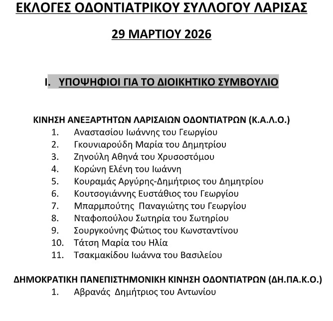 Η ημερομηνία διεξαγωγής αρχαιρεσιών του Οδοντιατρικού Συλλόγου Λάρισας, είναι η Κυριακή 29 Μαρτίου 2026. Η εκλογική διαδικασία θα πραγματοποιηθεί στα γραφεία του Συλλόγου, Ερ. Σταυρού 9-17, 3ος όροφος, από τις 09:00 π.μ. έως τις 19:00 μ.μ..